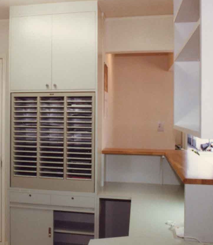 書類整理に特化した機能と、作業スペースを確保した一体型カウンターシステムの事例です。 棚一面に配置された細かな仕切り(スロット)により、カルテ、郵便物、伝票などを種類別・五十音順などに分類し、一目で必要な書類を見つけ出せる構造になっています。 上段は扉付きの収納棚で、機密性の高い書類や使用頻度の低い備品を保管。下段は引き出しや開き戸の収納スペースで、日常的に使用する事務用品や在庫を整理できます。