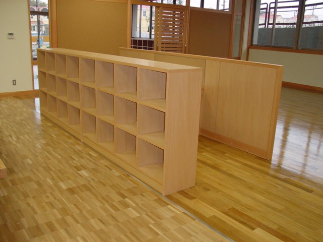 某中学校様へ設置させていただきました。 上段が開き戸、中段・下段が引き違い戸の収納棚です。